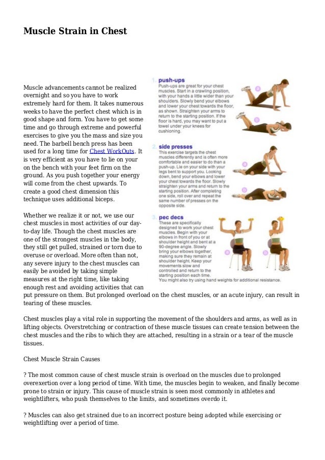 Sometimes, identifying the real cause of chest pain or pain under the ribs can be difficult. Pectoral muscle strains are grouped into grades depending on the severity of the muscle damage. Although injury is the most common cause of pulling your chest muscles, there are other factors that can contribute to pulled chest muscles. How long does it take to heal a pulled quad muscle? These muscles are involved in almost all arm movements and are needed for strength for example, pulling yourself up, lifting heavy objects, or doing pushups and other exercises.1 grade i chest muscle strains happen when parts of the chest muscle are pulled and tear a small number of fibers. See full list on healthyandnaturalworld.com William blahd recommends seeing a medical professional for chest muscle injury in the following situations:3 For any unusual chest pain, you should call the emergency services.11 Warren says that engaging in sports like football, hockey, rugby, wrestling, and skiing can result in mild to traumatic injuries to your upper chest.6 You will also find practical ways to treat pulled pectoral muscles at home to help them heal quickly and relieve any discomfort your pecs are causing. See full list on healthyandnaturalworld.com Injury to the chest muscles often occurs when the arm is extended. It may be painful to touch the pulled chest muscle and may affect your ability to continue any strenuous physical activity.